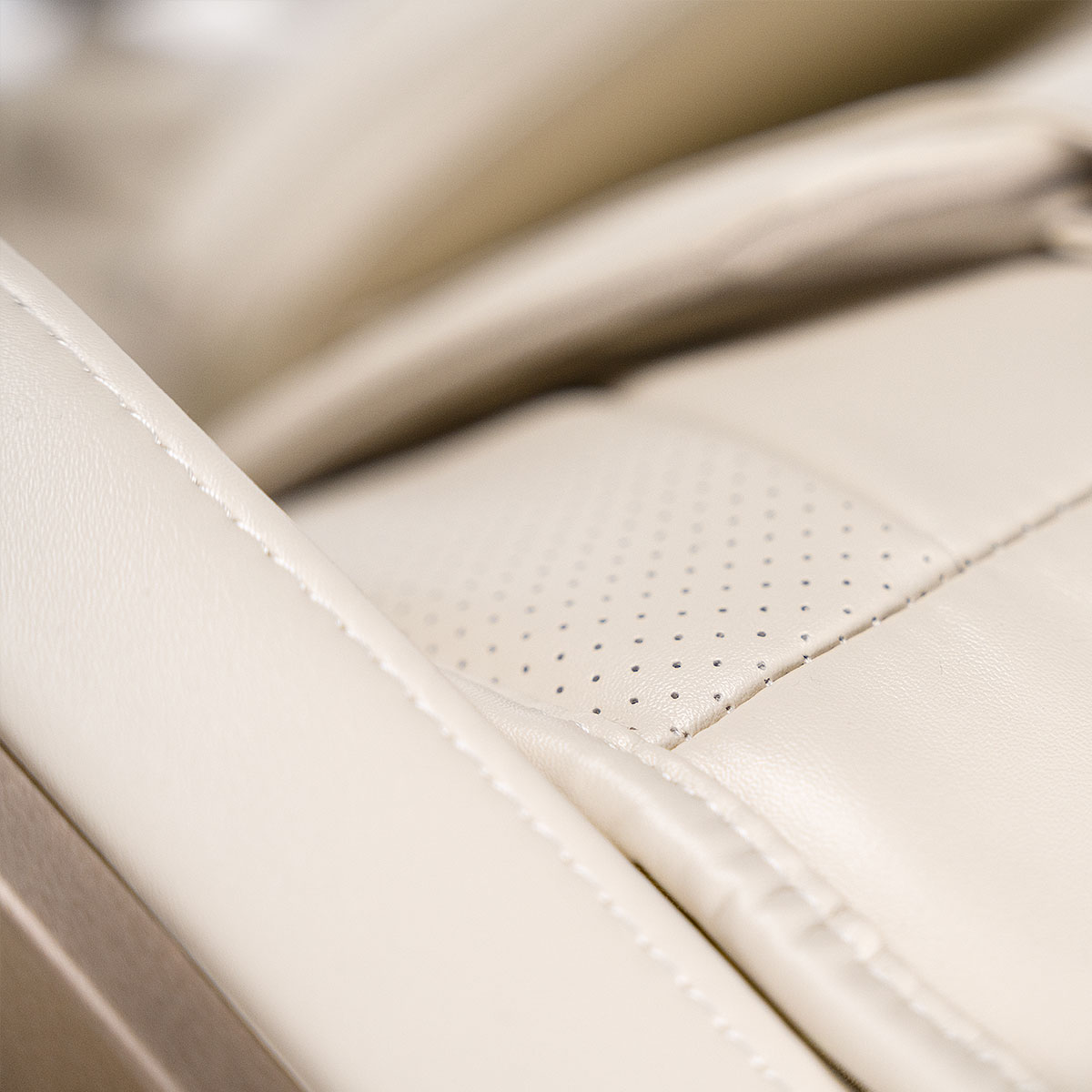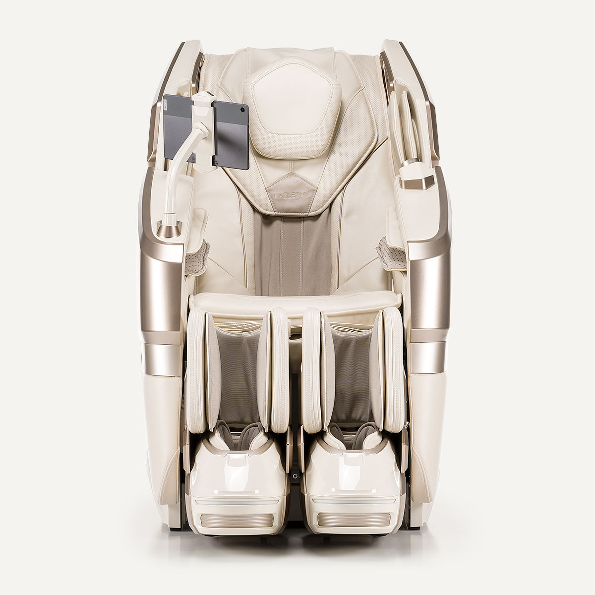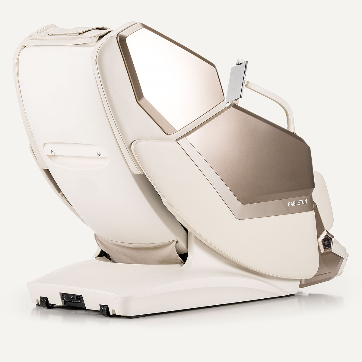 Modern und elegant verleiht der Eagleton jedem Interieur eine raffinierte Note. Seine geschmeidigen, aerodynamischen Linien und konturierten Seiten erinnern an hochfliegende Adlerflügel, während metallische Akzente sein hochwertiges Erscheinungsbild unterstreichen. Die Farbgebung in Creme und Gold sorgt für Wärme und macht diesen Massagesessel zu einer raffinierten und dennoch einladenden Ergänzung für moderne Räume.