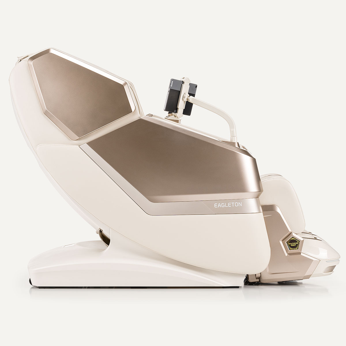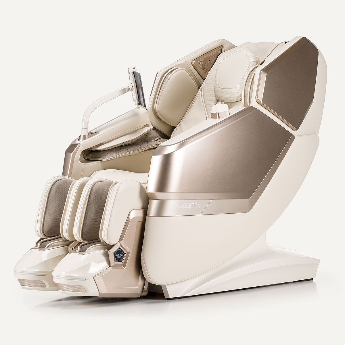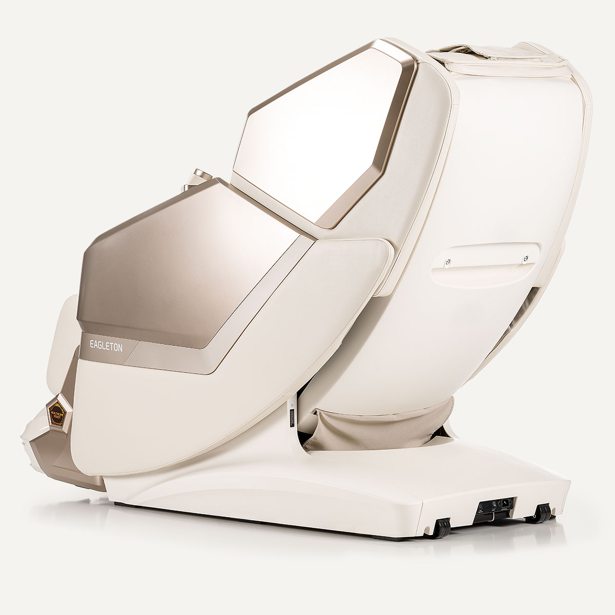 Modern and elegant, the Eagleton adds a sophisticated touch to any interior. Its smooth, aerodynamic lines and contoured sides resemble soaring eagle wings, while metallic accents elevate its premium feel. The cream-and-gold color scheme adds warmth, making this massage chair a refined yet inviting addition to contemporary spaces.