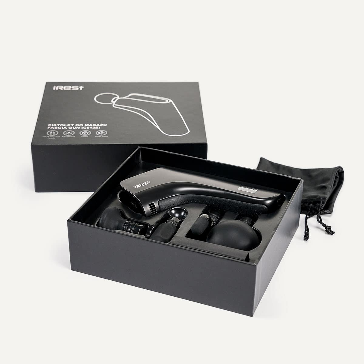 The device is shipped in an elegant black box. Included are a user manual in Polish, a user manual in English, a charging cable and a fabric pouch for storing the massage gun.