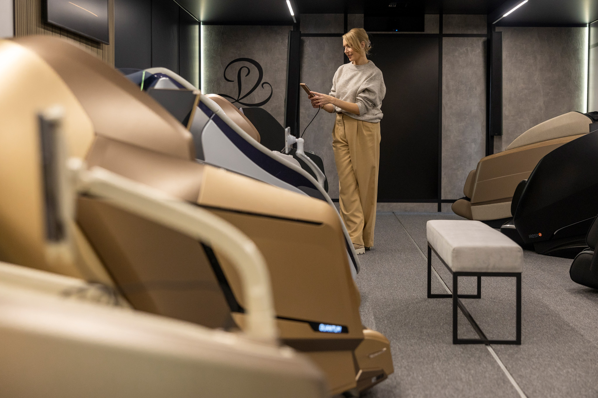 Masz pełną swobodę testowania: możesz dotknąć tapicerki, poczuć masaż, zmieniać ustawienia, zadawać pytania. Choć jesteś w showroomie sam, Doradca towarzyszy Ci zdalnie – dzięki systemowi R.A.R.E. (Remote Assistant Real Experience) widzisz go na ekranie, słyszysz i rozmawiasz tak, jakby był tuż obok. Wszystko po to, byś mógł wybrać fotel, który naprawdę Ci odpowiada.