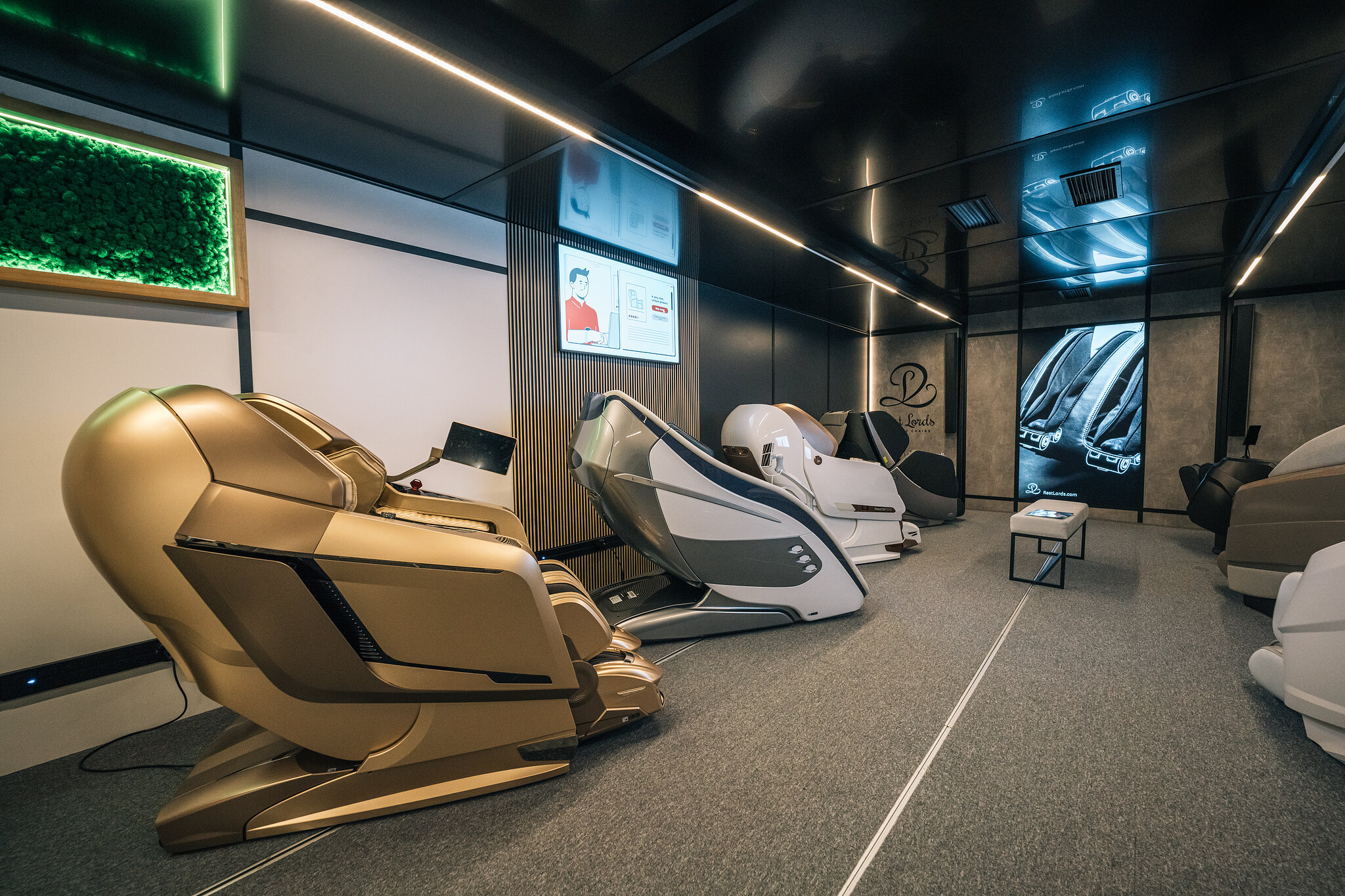 R-ShowRoad to pierwszy na świecie mobilny, półautonomiczny salon wystawowy foteli masujących. Wnętrze specjalnie zaprojektowanej, rozsuwanej naczepy o powierzchni 52,1 m² mieści aż 12 foteli masujących marek iRest, Bodyfriend, Fujiiryoki i Massaggio – starannie wyselekcjonowanych modeli reprezentujących różne półki cenowe i funkcjonalności. Wizyta w salonie odbywa się tylko po uprzedniej rezerwacji. Przed umówioną wizytą, nasz Doradca skontaktuje się z Tobą, aby ustalić szczegóły, a podczas wizyty będzie Ci towarzyszyć zdalnie służąc wszelką pomocą w wyborze najodpowiedniejszego modelu, tak jakby był tuż obok. W salonie jest możliwość złożenia zamówienia i płatności elektronicznych. Ze względu na charakter salonu nie ma możliwości płatności gotówką.
